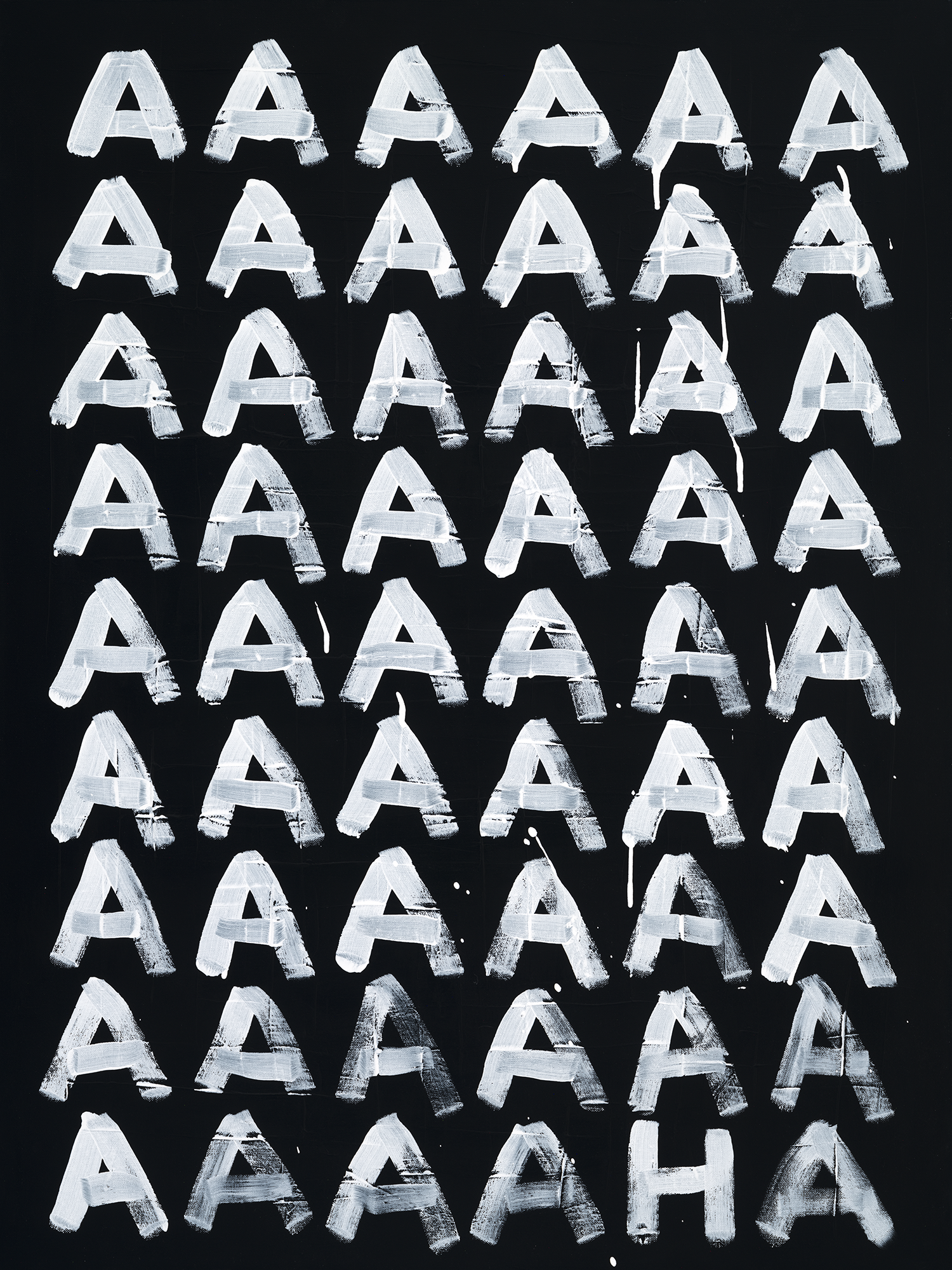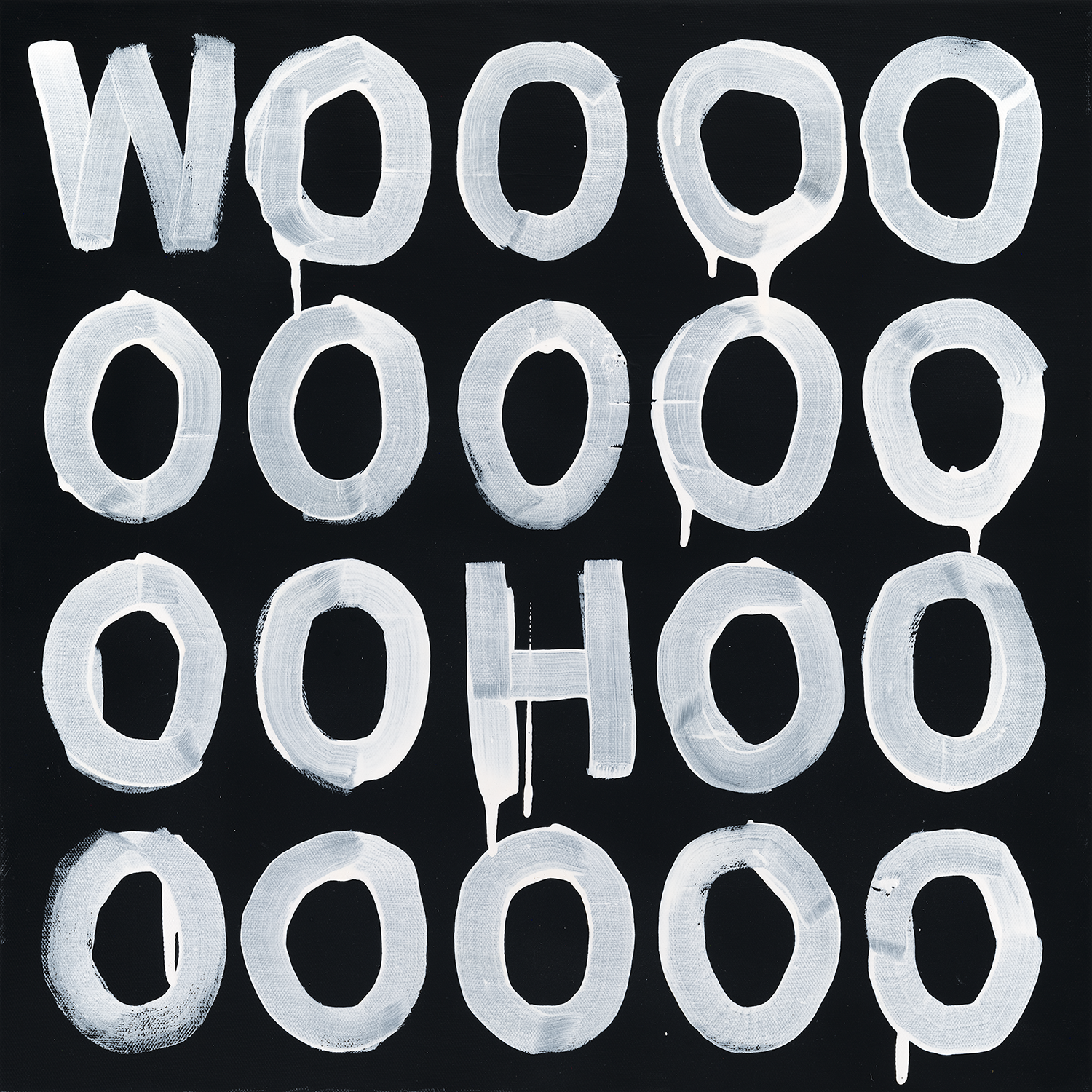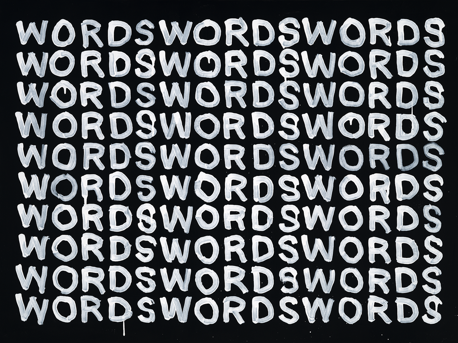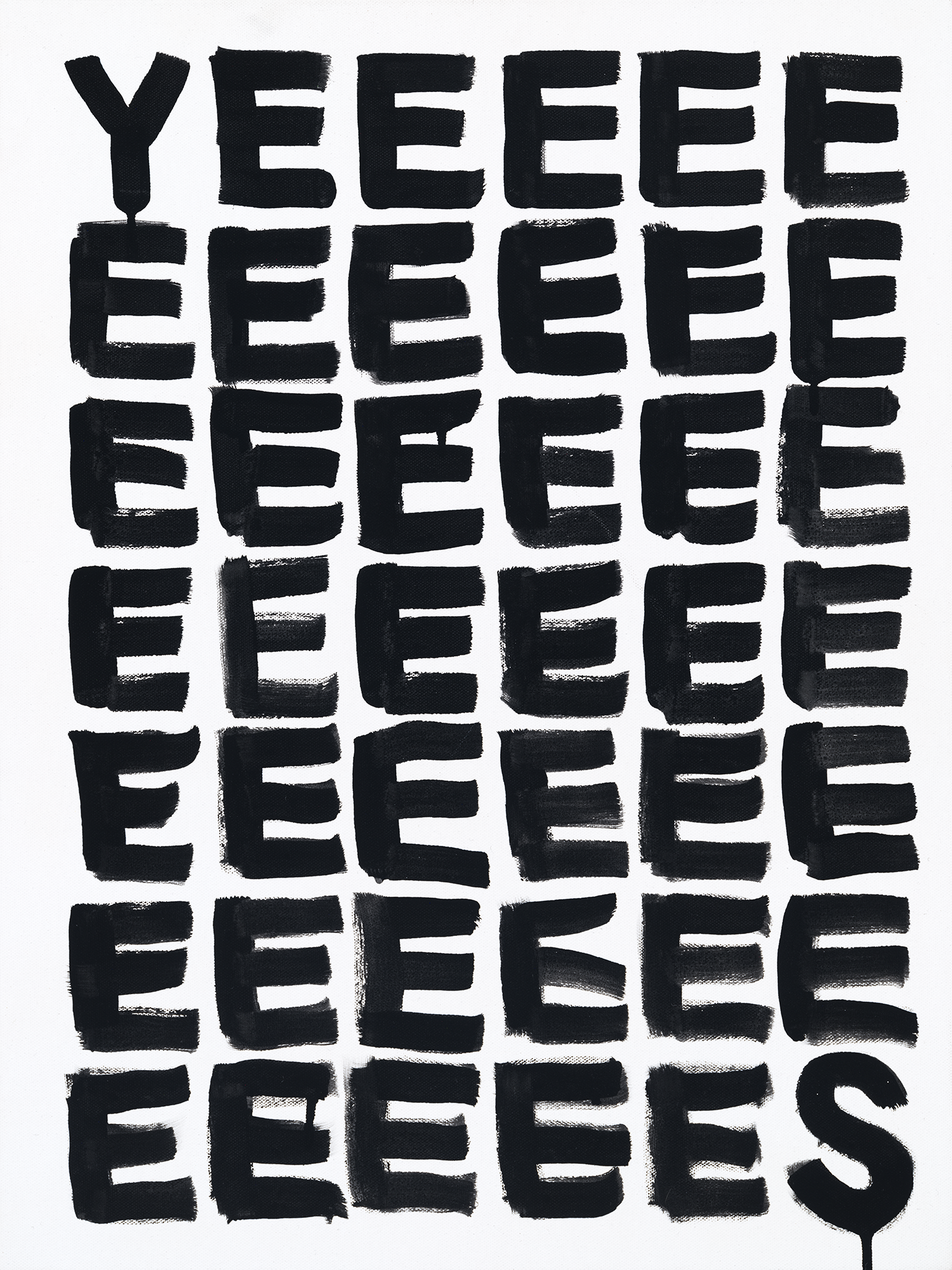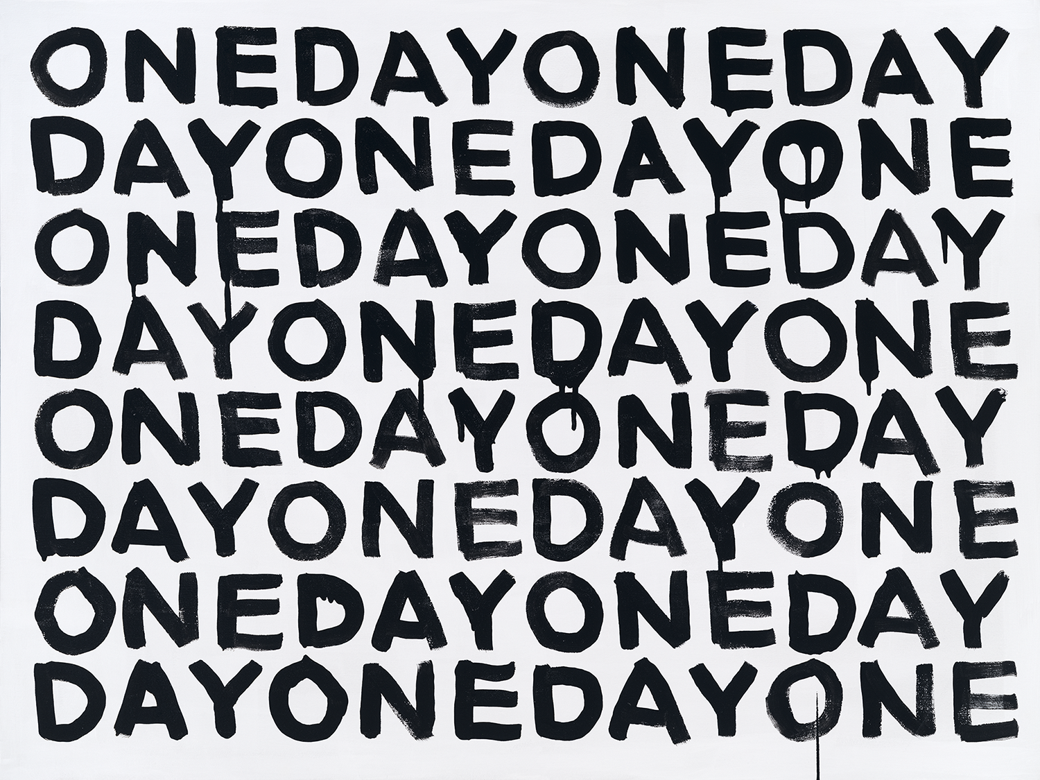 A black-and-white series exploring language as visual structure. Words and letterforms are treated less as statements and more as graphic elements repeated, compressed, and arranged into simple geometric compositions. Executed with intentionally loose, dripping paint, the work balances order and imperfection, creating a quiet tension between control and spontaneity. Many of the phrases carry subtle optimism, while the repetitive, meditative process recalls the act of writing the same phrase again and again—part reflection, part visual mantra.