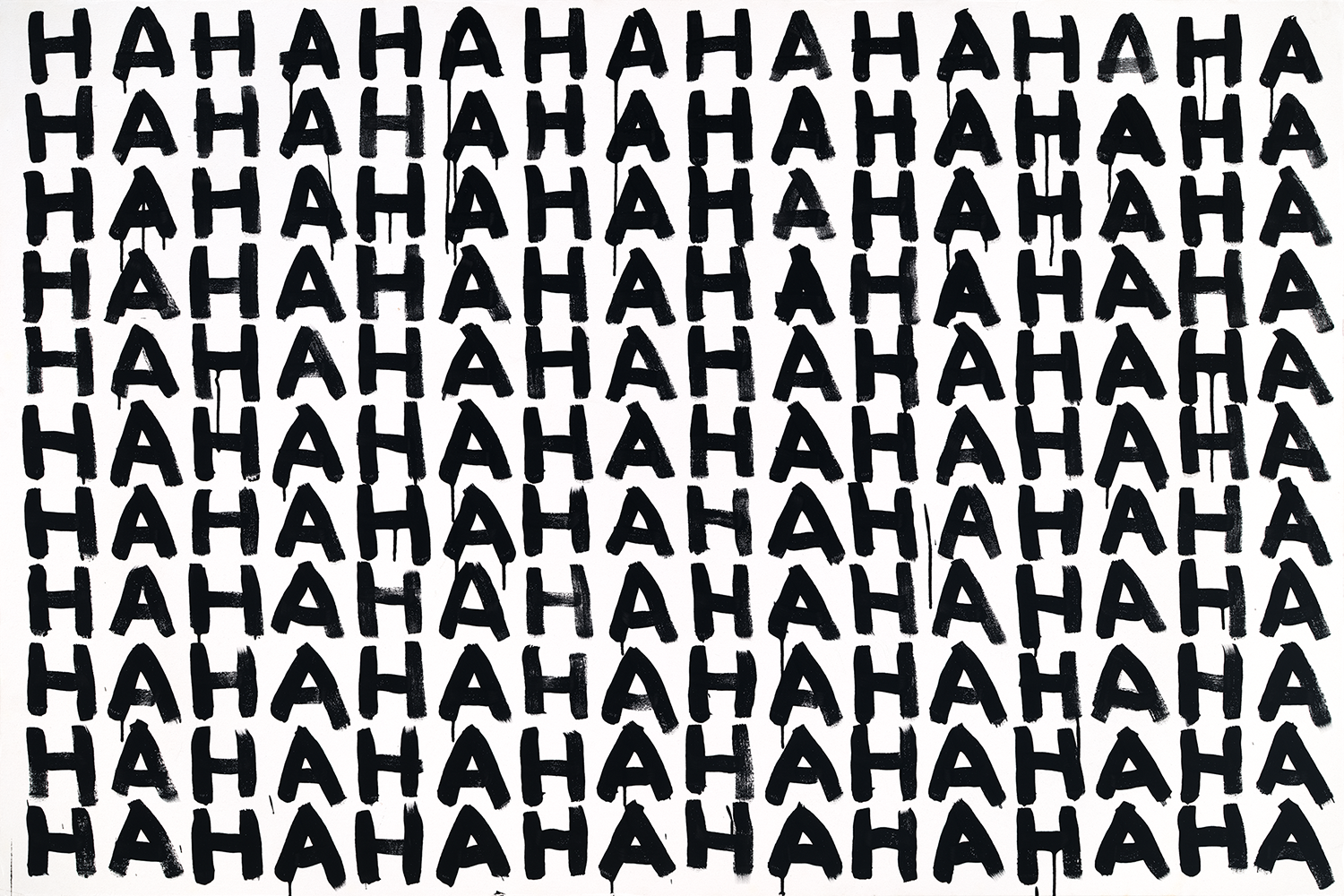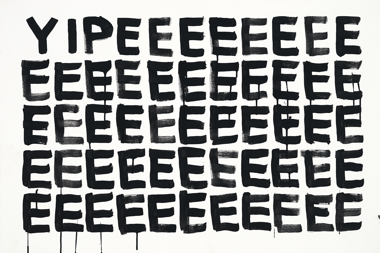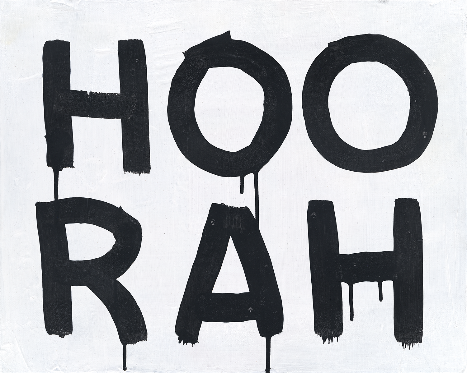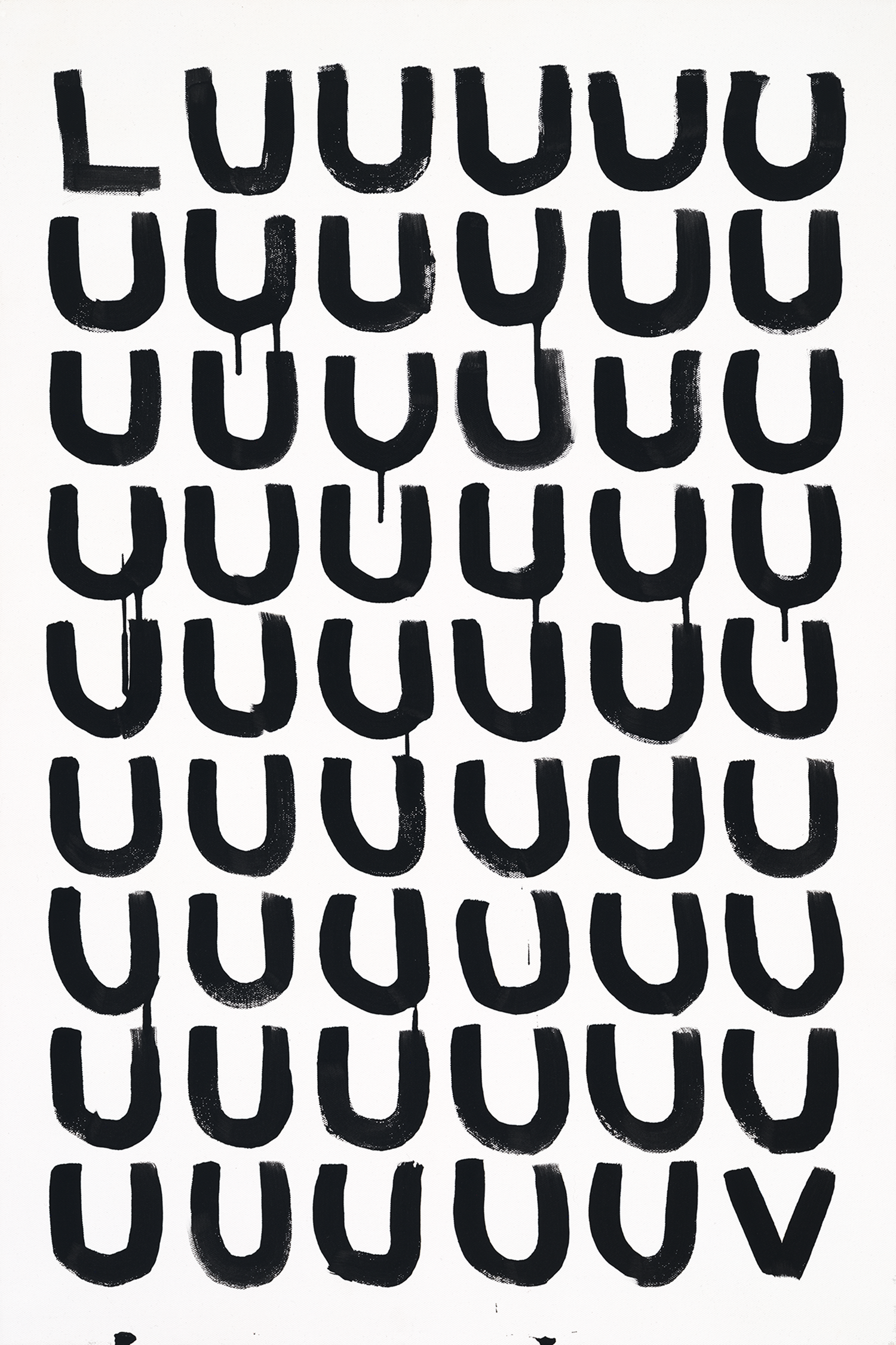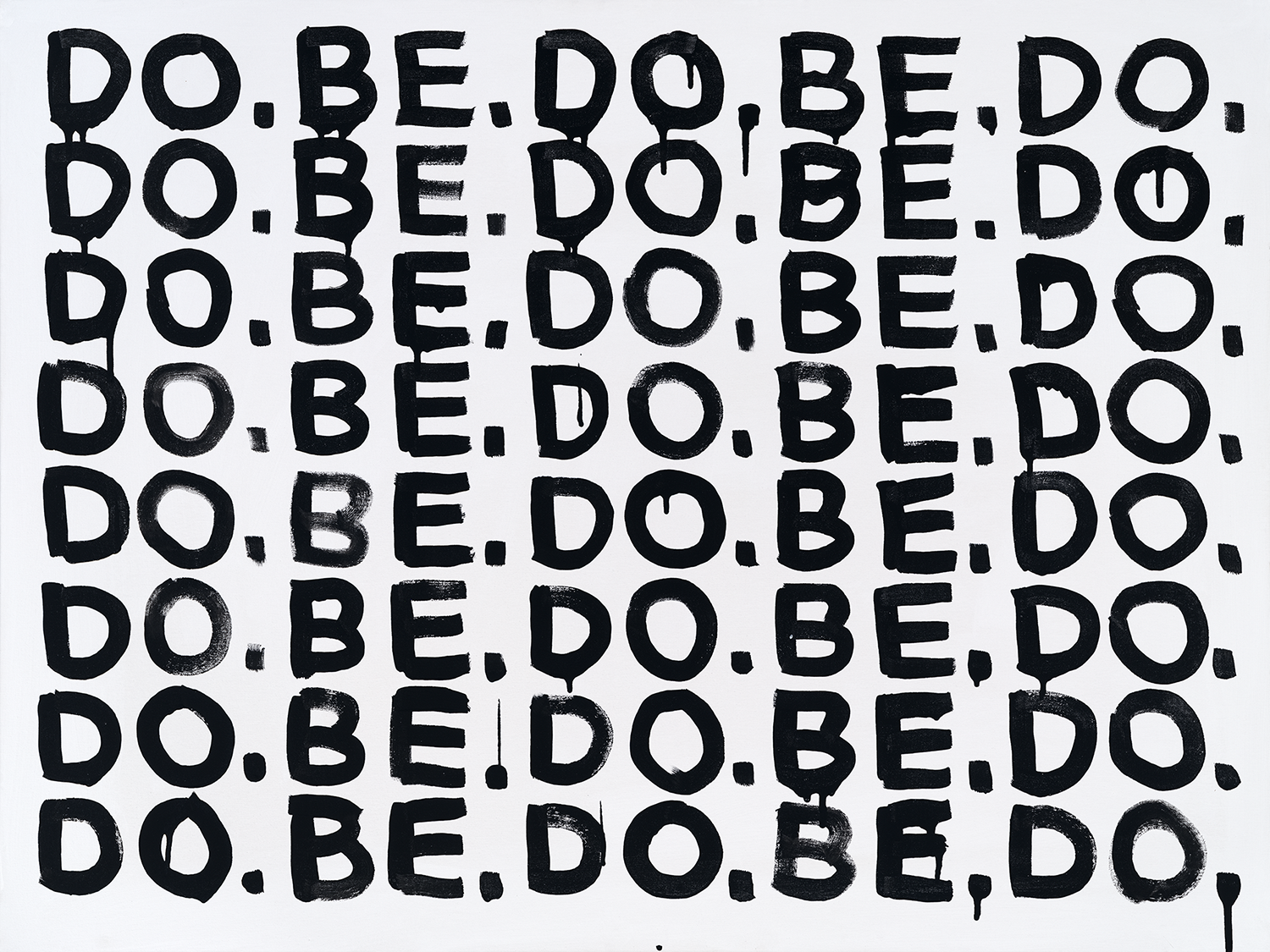 A black-and-white series exploring language as visual structure. Words and letterforms are treated less as statements and more as graphic elements repeated, compressed, and arranged into simple geometric compositions. Executed with intentionally loose, dripping paint, the work balances order and imperfection, creating a quiet tension between control and spontaneity. Many of the phrases carry subtle optimism, while the repetitive, meditative process recalls the act of writing the same phrase again and again—part reflection, part visual mantra.